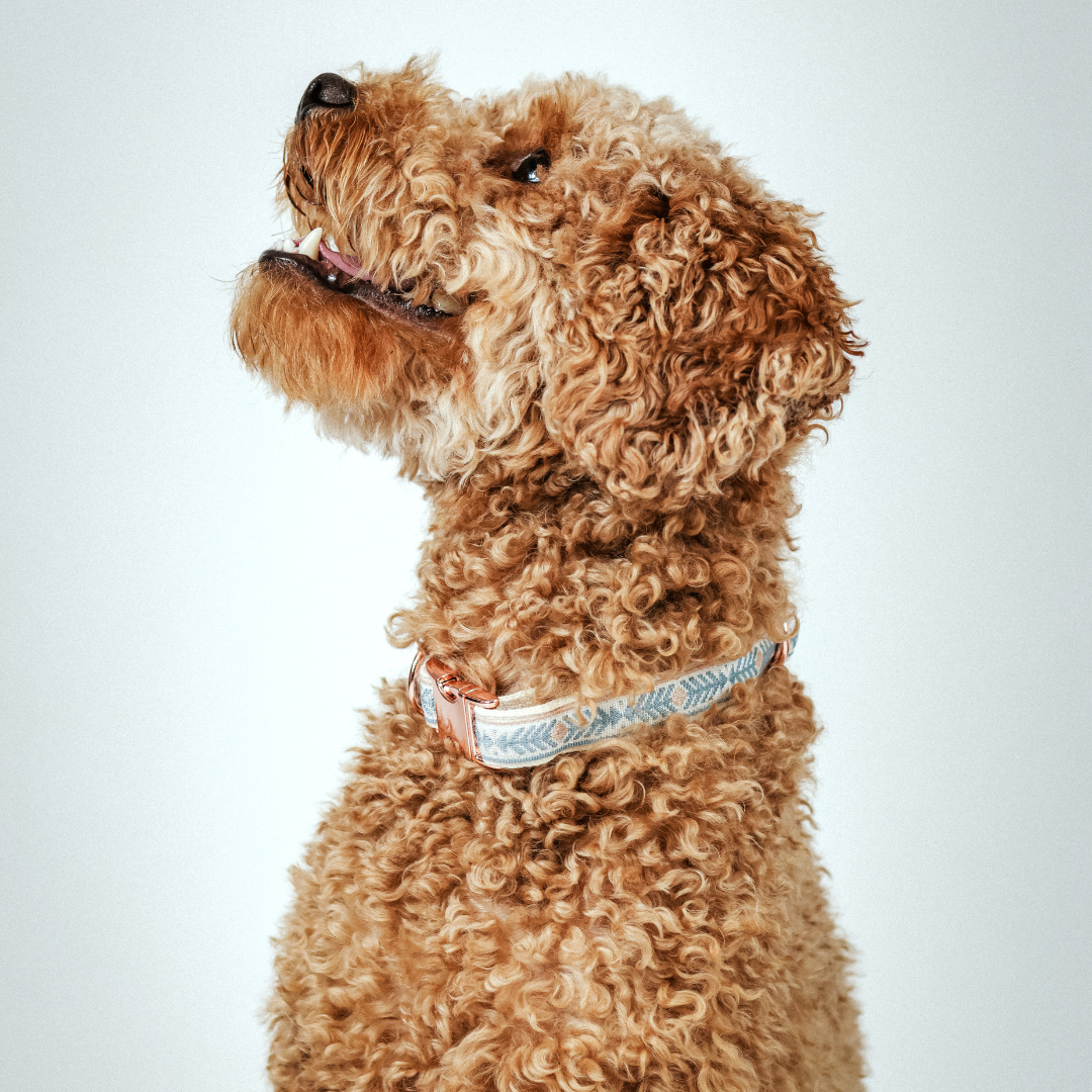 Dieses Halsband gehört zu unserer Webband-Kollektion und verbindet natürliche Materialien mit einem dekorativen, aufgenähten Jacquard-Webband.