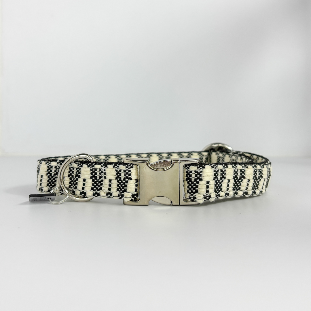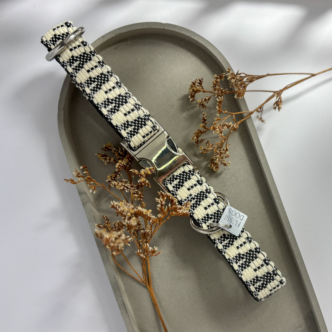 Dieses Halsband gehört zu unserer Klassiker-Kollektion und wird aus einem hochwertigen, fest gewebten Polyester-Gurtband gefertigt. Jede Kollektion hat ihr ganz eigenes Muster und ihren eigenen Look – dadurch bekommt jedes Halsband seinen ganz individuellen Charakter.