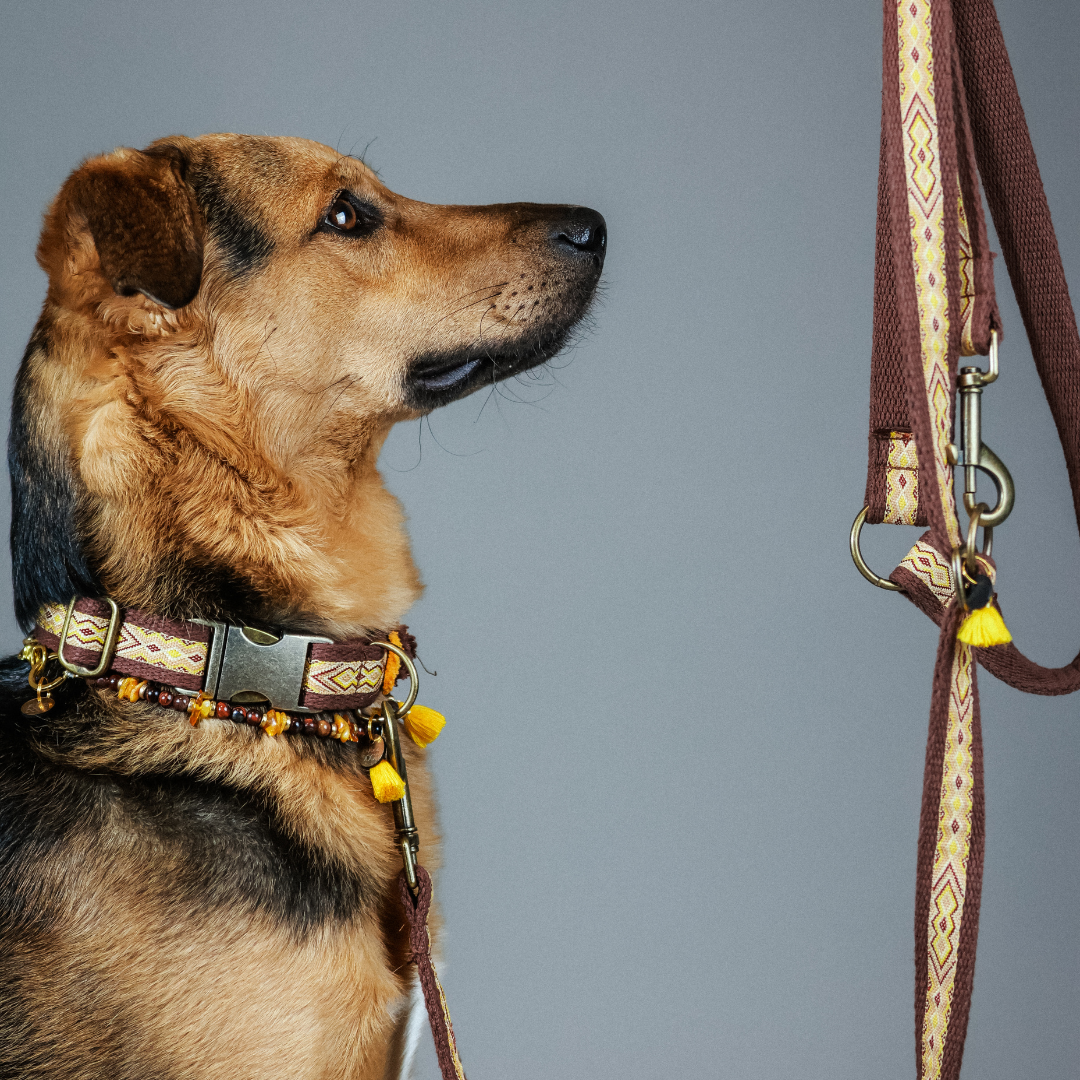 Dieses Halsband gehört zu unserer Webband-Kollektion und verbindet natürliche Materialien mit einem dekorativen, aufgenähten Jacquard-Webband.