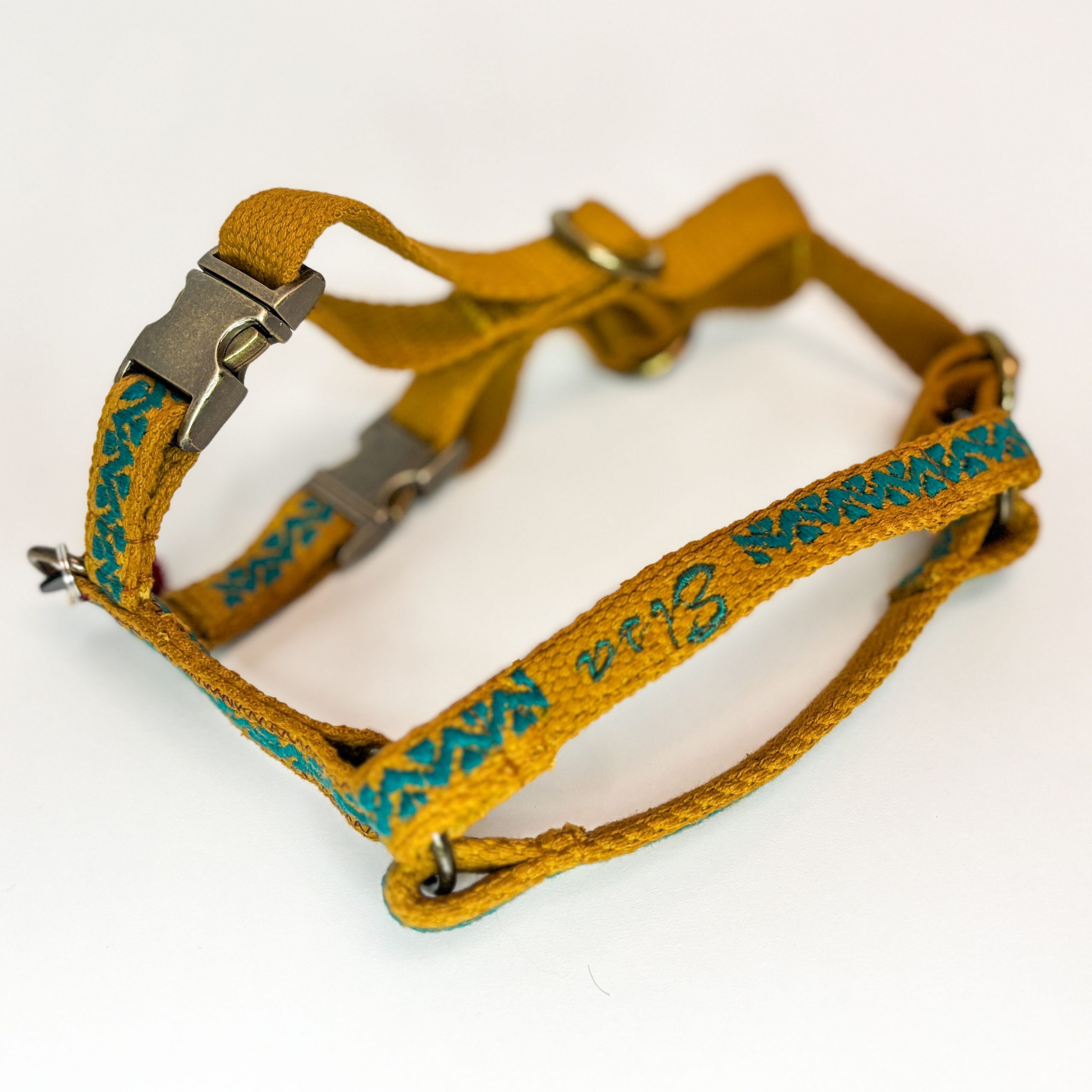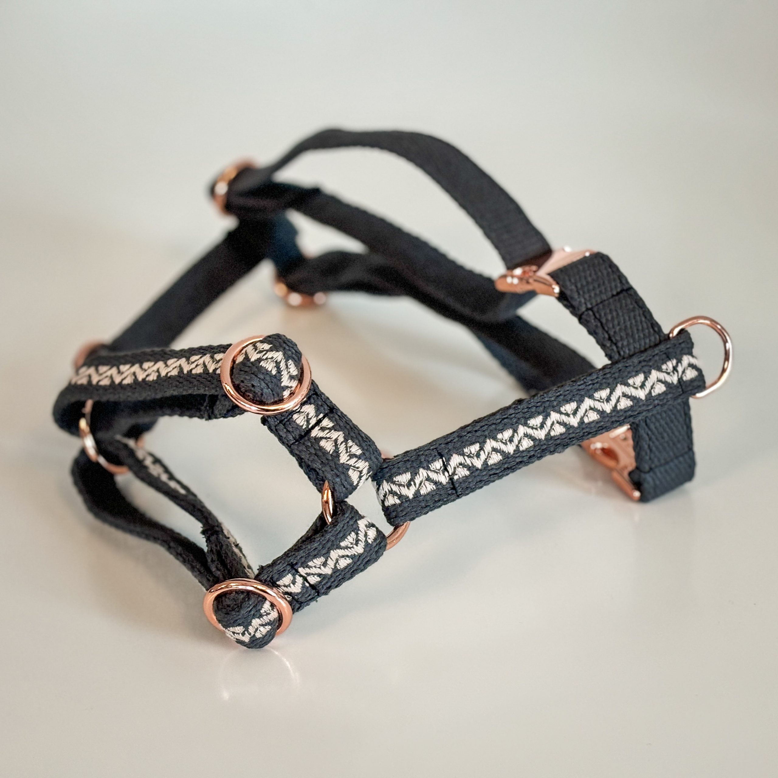 Das weiche Baumwollgurtband wird durch einen bestickten Mittelstreifen ergänzt, der dem Geschirr seinen ganz eigenen, handgemachten Charakter verleiht.