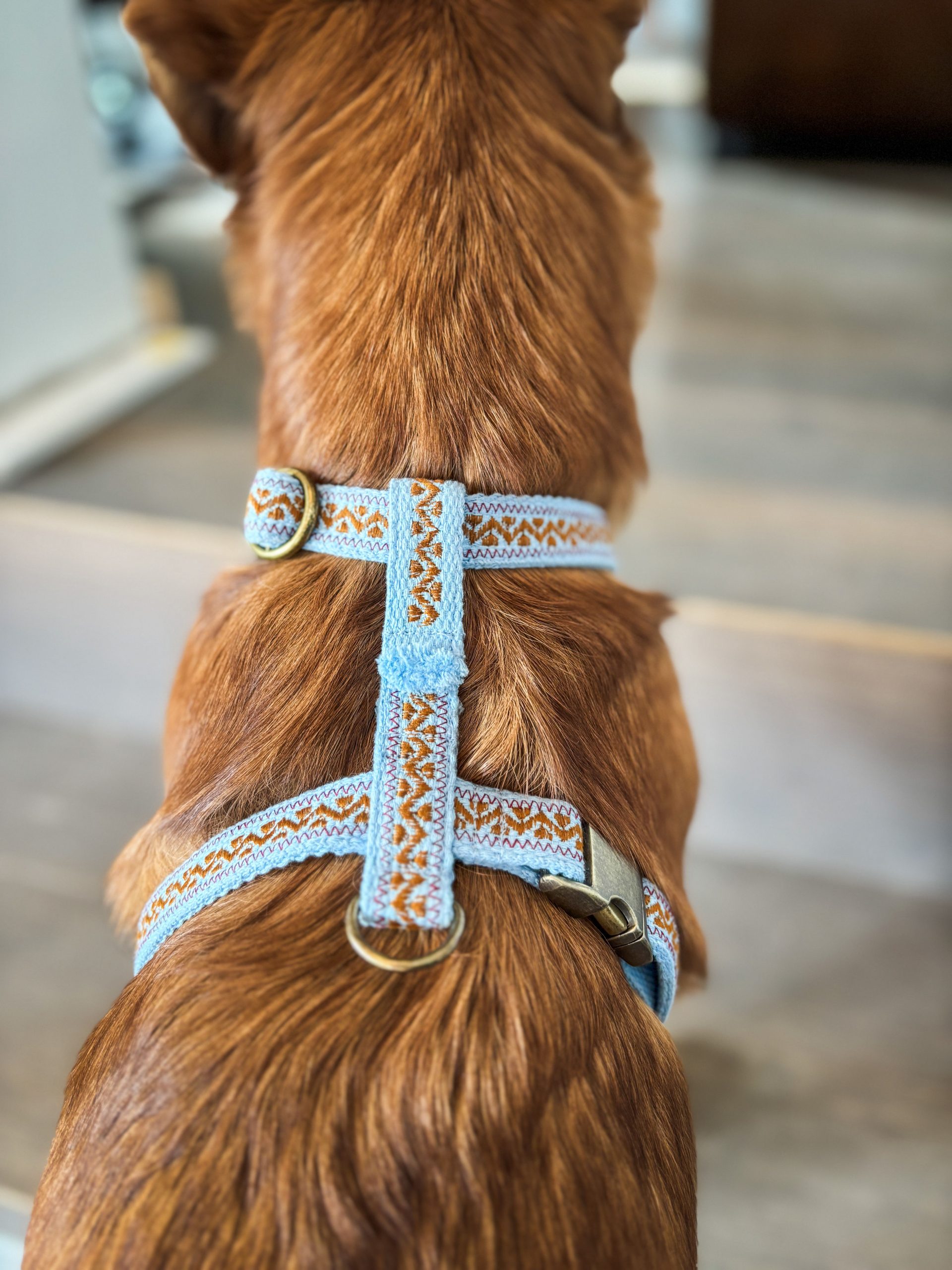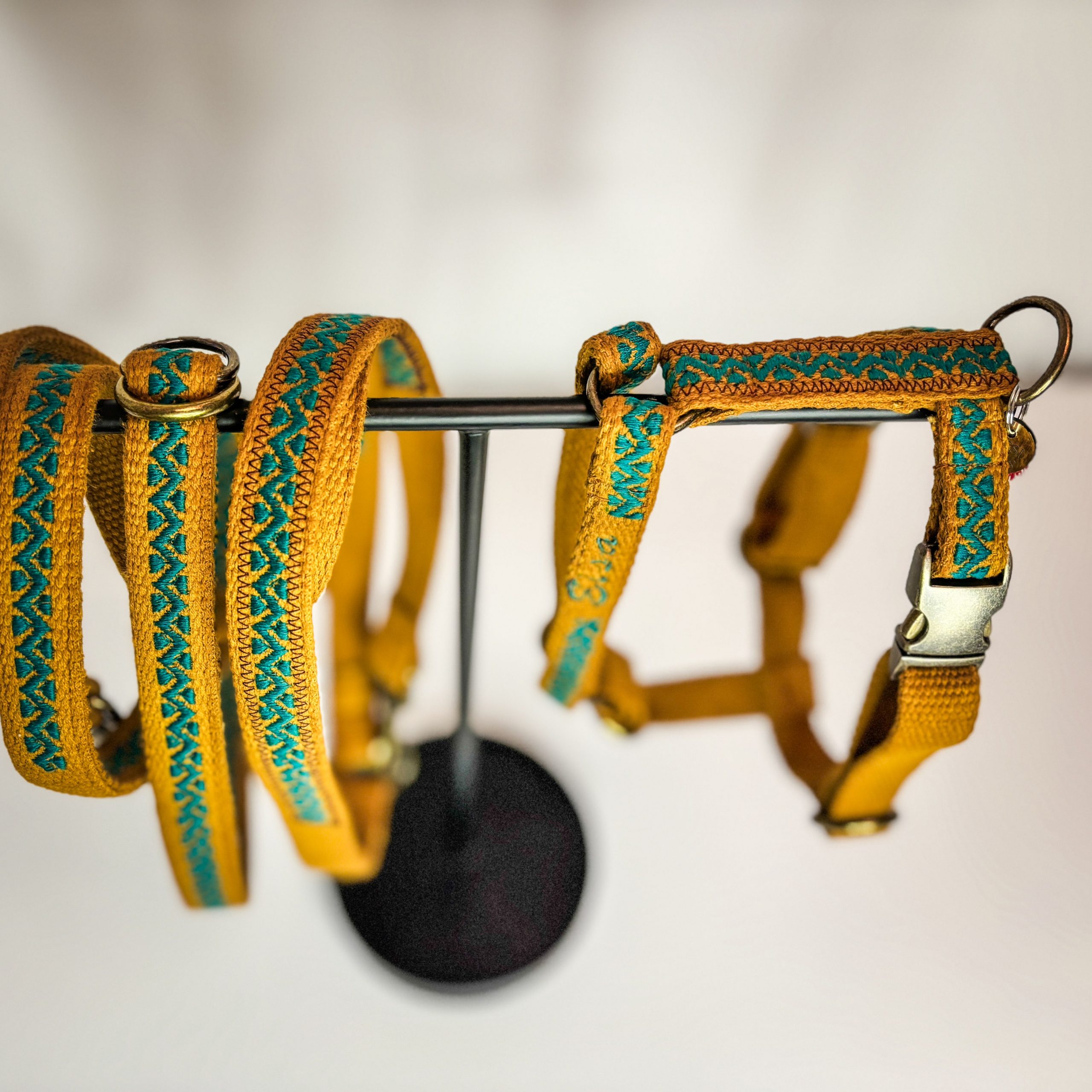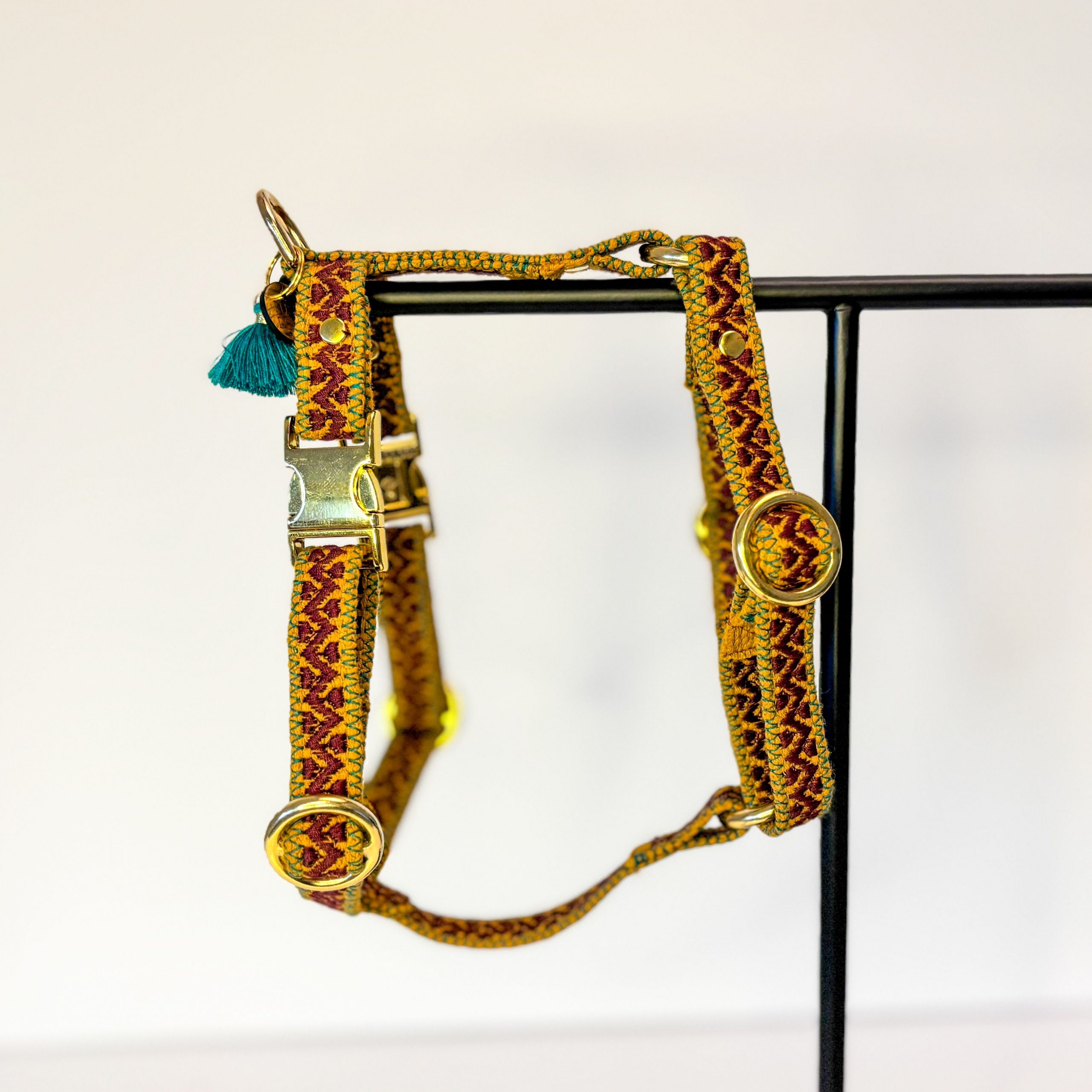 Damit das Geschirr perfekt zu deinem Hund passt, kannst du die Farbe des Gurtbandes sowie die Farbe der mittleren Stickerei selbst auswählen.