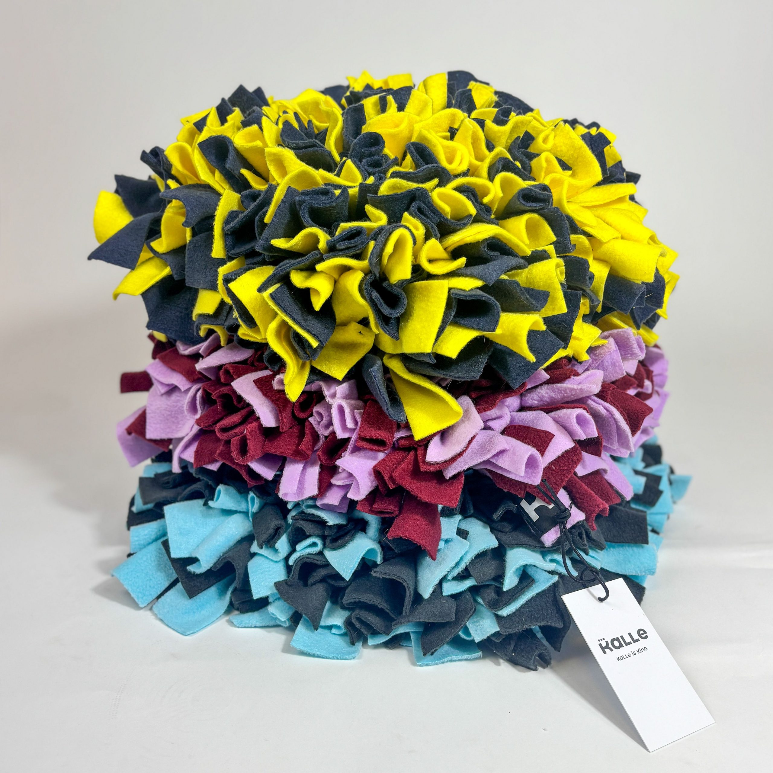 Die handgemachten Schnüffelteppiche von KALLE IS KING sind die perfekte Kombination aus Spaß, Auslastung und Kopfarbeit. Zwischen den fest geknoteten Fleece-Streifen lassen sich Leckerlis oder Trockenfutter verstecken, die dein Hund mit seiner Nase erschnüffeln darf. Durch die dichte und feste Knotenarbeit ist der Teppich besonders robust und sorgt für langanhaltende Beschäftigung.